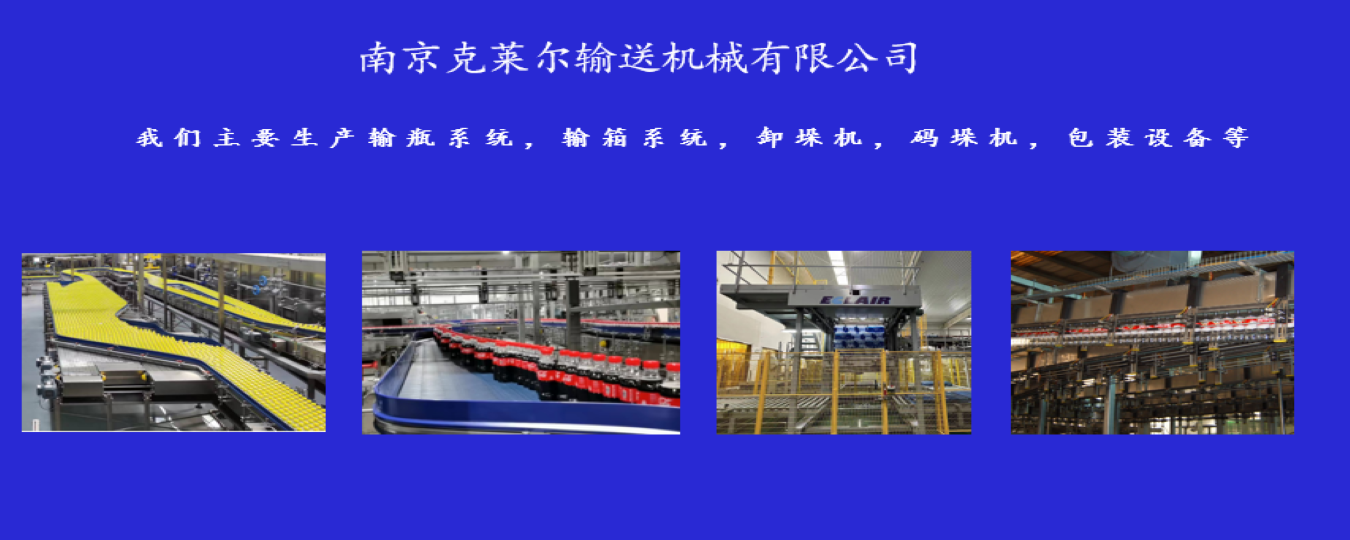 南京克萊爾輸送機(jī)械有限公司成立于2007年,是一家中法合資企業(yè),主要生產(chǎn)空氣輸送系統(tǒng),輸瓶系統(tǒng),輸箱系統(tǒng),碼垛機(jī),包裝機(jī)等設(shè)備。